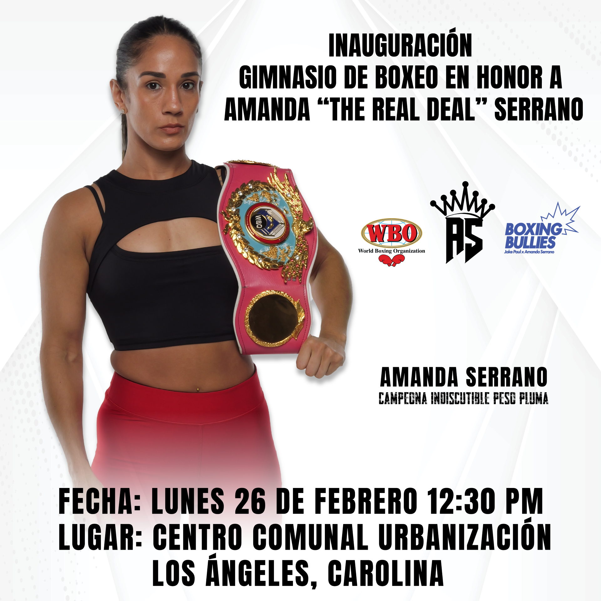 La campeona mundial en 7 divisiones de peso, Amanda ” The Real Deal” Serrano inaugurará un renovado gimnasio de boxeo en Carolina, Puerto Rico, esto en colaboración con la fundación “Boxing Bullies” de Jake Paul y la Organización Mundial de Boxeo. El evento tendrá lugar el lunes, 26 de febrero a partir de las 12:30 a.m. Más detalles a continuación: