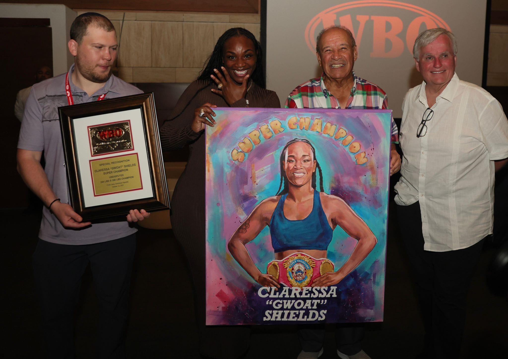 During the meeting of boxing personalities and WBO officials, the undisputed female champion of 154 and 160 pounds and WBO Super Champion Claressa Shields, was honored with a beautiful painting and plaque from the WBO for the award of Special Recognition for her historic achievements.