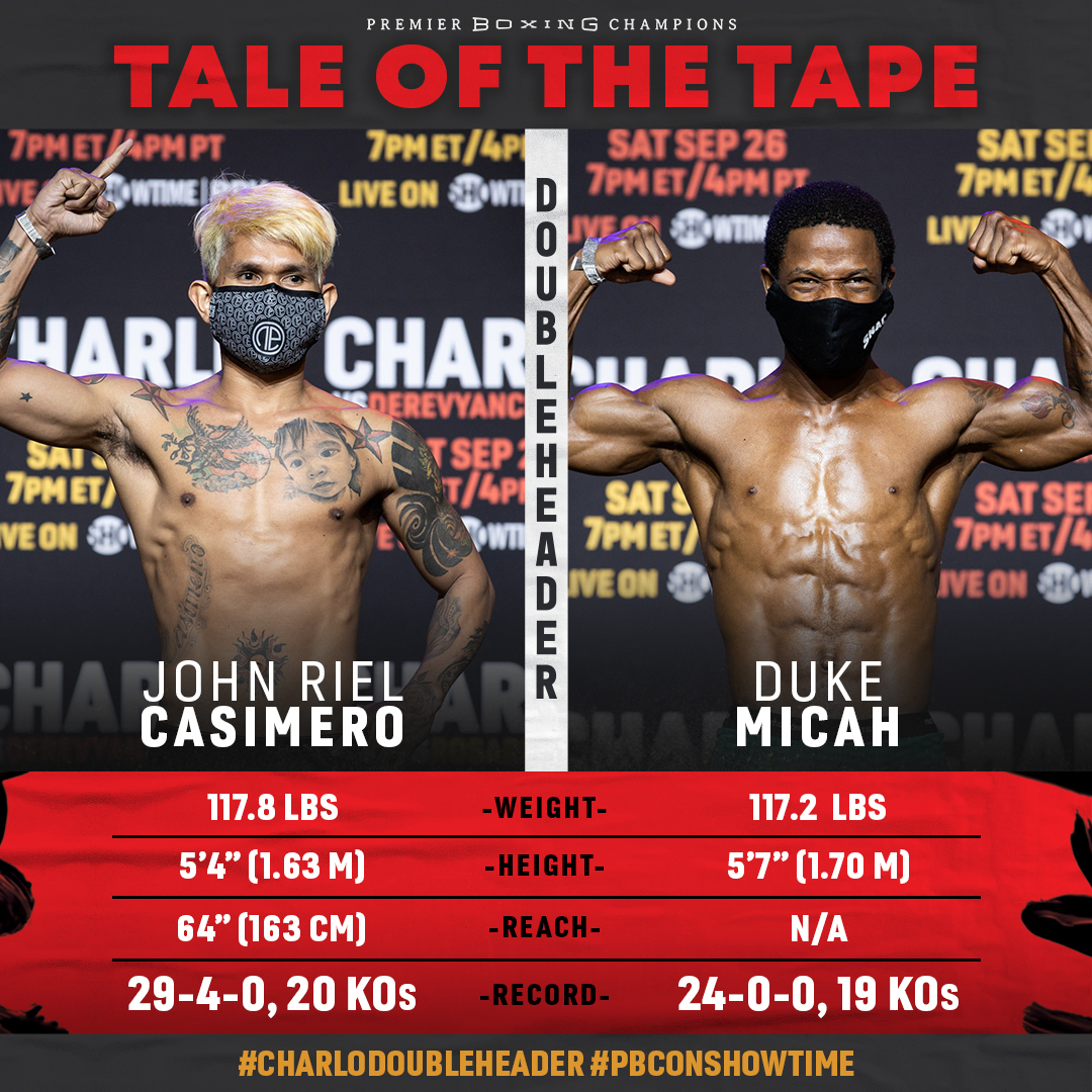 Weigh-In: WBO Bantamweight World Champion John Riel Casimero weighed 117 ¾ and undefeated challenger Duke Micah 117 ¼ for tomorrow night @ Mohegan Sun Casino, Uncasville, Connecticut, USA #CharloDoubleheader Showtime #PPV