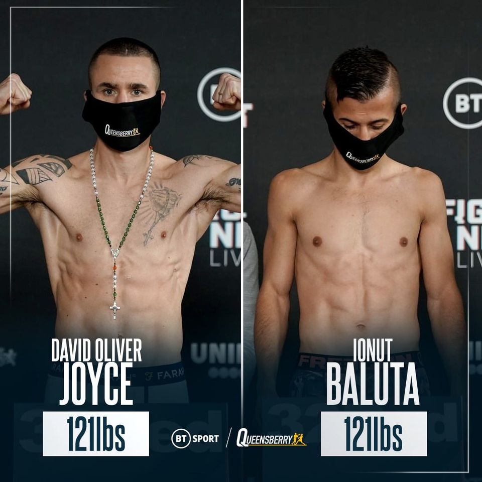 Weigh-In: WBO European Jr. Featherweight Champion David Oliver Joyce weighed 121 lbs and Ionut Baluta 121 lbs for tomorrow night @ BT Sport Studio, Stratford, London, United Kingdom.